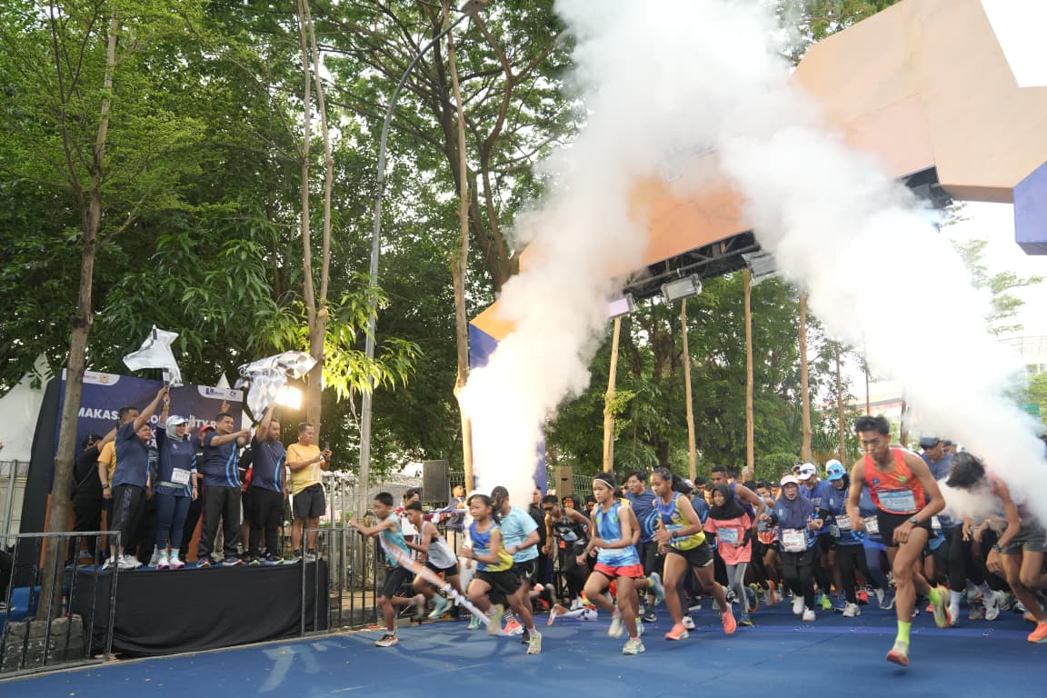 Sorakan semangat dan kibaran bendera start menandai langkah awal para pelari menyusuri rute perkotaan Makassar yang akan berakhir di Lapangan Karebosi.